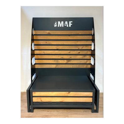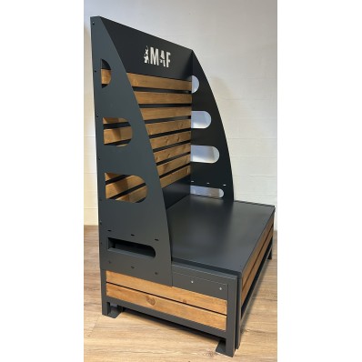 Un présentoir à féculents en acier et bois, conçu pour stocker et mettre en valeur de grands sacs de riz, pâtes, ou autres produits alimentaires en vrac. Son design robuste et élégant en fait un choix parfait pour optimiser l’espace tout en offrant une présentation pratique et esthétique.