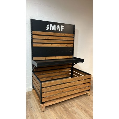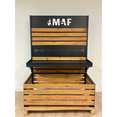 Un présentoir à palette en acier et bois, à la fois moderne et pratique, conçu pour mettre en valeur vos produits tout en optimisant l'espace de vente. Sa structure robuste et son design élégant en font un choix idéal pour toute boutique ou événement.