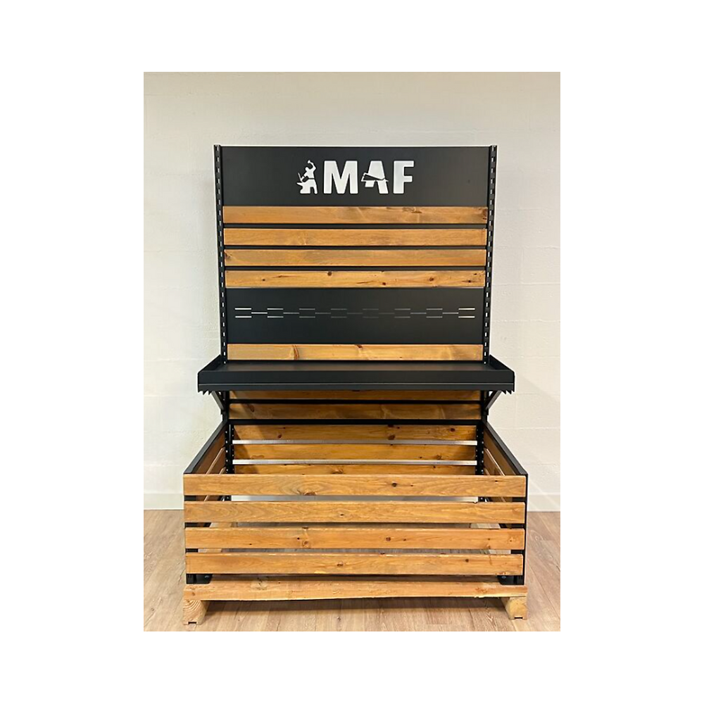 Le présentoir à palette combine l’acier robuste et le bois chaleureux pour offrir une solution de présentation à la fois pratique et esthétique. Sa structure en acier garantit une grande durabilité, tandis que le bois apporte une dimension élégante et raffinée.