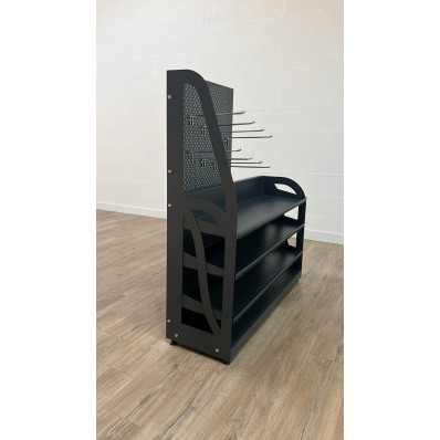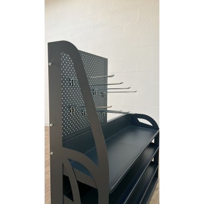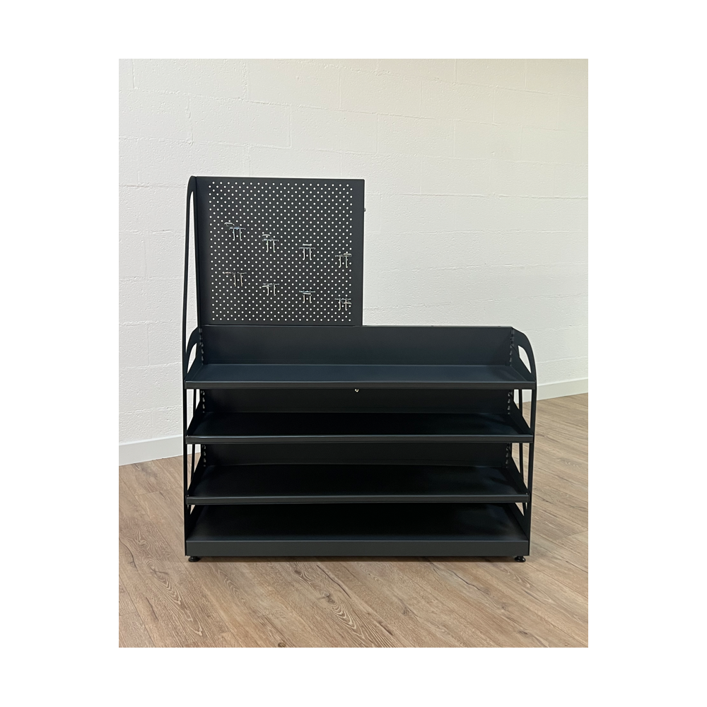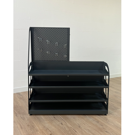 Le stand présentoir pour meuble caisse est conçu avec un panneau perforé et se compose de quatre niveaux d'étagères en gris anthracite.